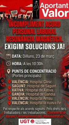 UGT Serveis Públics PV ha convocado concentraciones este lunes 23 de marzo para exigir a la Conselleria de Sanidad la publicación inmediata en el DOGV