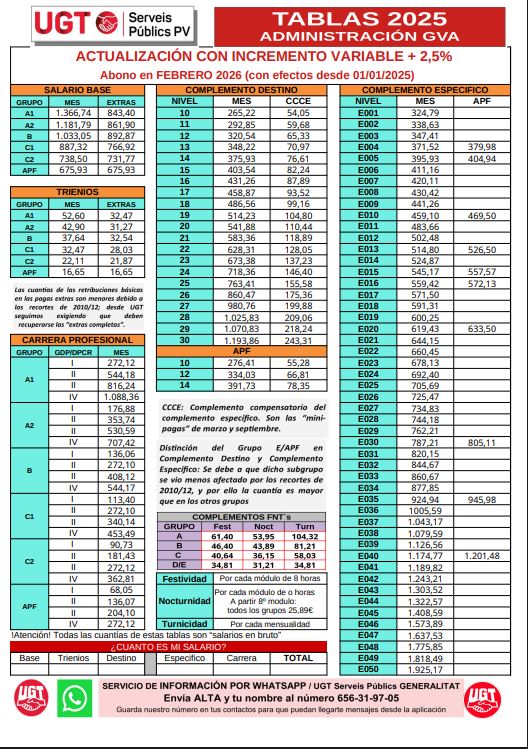 Consulta cómo quedan las tablas retributivas para el personal de la Generalitat correspondientes al año 2025 con el aumento del 2,5% y recuerda que estas