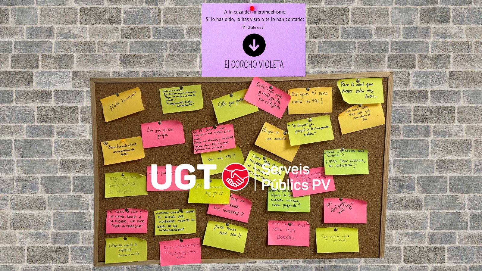 Con toda la seriedad que este tema conlleva, pero también con cierta dosis de humor, UGT Serveis Públics puso en marcha ya hace algunos meses en la sede del sindicato una experiencia piloto: un corcho violeta en el que ‘atrapar’ con post it, los micromachismos que escuchan o presencian las trabajadoras de la casa. Tras meses en marcha, el corcho violeta ha tenido gran aceptación y ha servido para visibilizar situaciones que antes pasaban desapercibidas pero son negativas para quienes las padecen ya que lejos de ser inofensivos cuestionan la capacidad de liderazgo de las mujeres o bromean sobres aspectos físicos o emocionales.