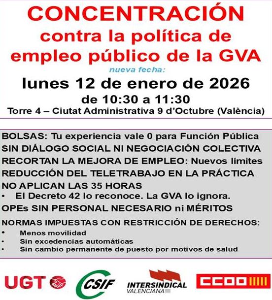 Las organizaciones sindicales UGT Serveis Públics PV, CSIF, Intersindical Valenciana y CCOO han convocado una concentración este lunes, 12 de enero, en la Torre 4 de la Ciutat Administrativa 9 d’Octubre, para exigir a la Generalitat Valenciana un cambio de rumbo en su política de empleo público y el cumplimiento de sus compromisos en materia de jornada, teletrabajo, bolsas y oferta de empleo. La concentración se ha cancelado ante la previsión de condiciones meteorológicas adversas y será convocada en fechas próximas.