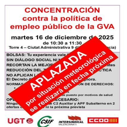 Las organizaciones sindicales UGT Serveis Püblics, CSIF, Intersindical Valenciana y CCOO han aplazado la concentración prevista para hoy martes 16 de diciembre en la Torre 4 de la Ciutat Administrativa 9 d’Octubre, para exigir a la Generalitat Valenciana un cambio de rumbo en su política de empleo público y el cumplimiento de sus compromisos en materia de jornada, teletrabajo, bolsas y oferta de empleo. La concentración se ha cancelado ante la previsión de condiciones meteorológicas adversas y será convocada en fechas próximas.
