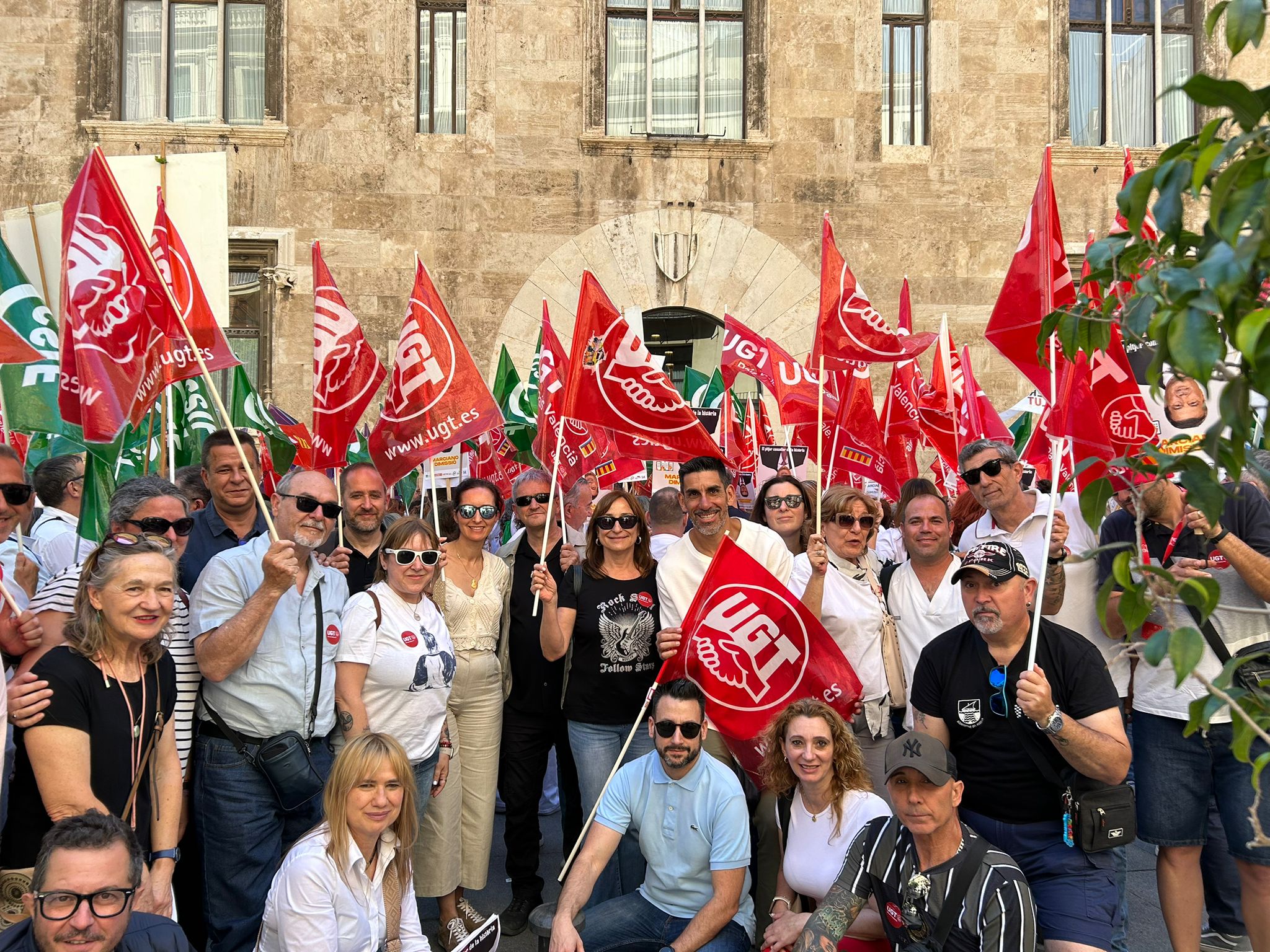 Trabajadoras y trabajadores públicos de la sanidad valenciana convocados por UGT Serveis Públics y los sindicatos Satse, CC OO, CSIF, Intersindical Salut i SAE se han concentrado este lunes, 26 de mayo, frente al Palau de la Generalitat para reclamar la dimisión del conseller de Sanidad, Marciano Gómez y exigir al president, Carlos Mazón, una solución frente al deterioro de la Sanidad pública valenciana y ante la falta de diálogo y la nefasta gestión del conseller de Sanidad.