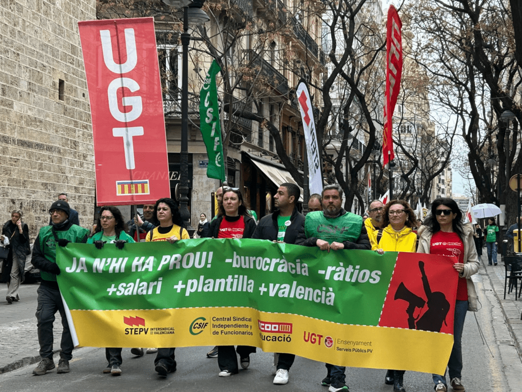 La comunitat educativa ha eixit hui al carrer per a exigir a la Conselleria d’Educació un calendari de negociacions de la plataforma reivindicativa sindical. La resposta a les mobilitzacions convocades pels sindicats UGT Serveis Públics, STEPV, CSIF i CCOO en València, Castelló y Alcacant ha sigut tot un èxit. Centenars de persones han clamat contra el deteriorament de la negociació col·lectiva i la falta de voluntat real de l’administració per a abordar els problemes que asfixien el sistema educatiu valencià. Tot i el compromís genèric de la Consellera M. Carmen Ortí d’iniciar converses al març, la falta de dates i de continguts concrets manté el professorat en alerta.