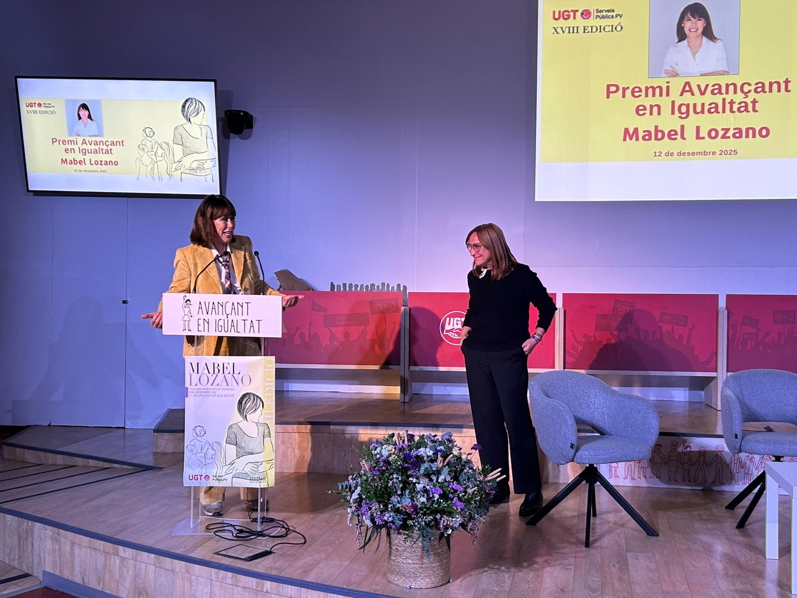 Tras los discursos, la ceremonia ha proseguido con un debate moderado por la responsable de Mujer de UGT Serveis Públics, Laura Barrios, y en la que han participado Lozano y Montaner. Barrios, presidenta de Dones Joves, ha introducido en el coloquio cuestiones claves como la pornografía, la prostitución 2.0 y el fenómeno de captación de mujeres a través de plataformas como only fans. Las tres han coincidido en que el feminismo sólo puede ser abolicionista. Con Mabel Lozano, el Premi Avançant en Igualtat suma ya 18 reconocimientos a mujeres referentes y entidades comprometidas por la igualdad y redobla el compromiso de UGT Serveis Públics con el feminismo. En su primera edición (2008) el premio fue concedido a la presidenta del Tribunal Constitucional, María Emilia Casas. El último, en 2024, recayó en la periodista Pepa Bueno. Además han sido premiadas la asociación de juristas Themis, la exvicepresidenta del Gobierno, Carmen Calvo, la filosofa Adela Cortina, Unifem y la Comisión de Mujeres por una Paz en Palestina-Israel. Además, la socióloga María Ángeles Durán, la escritora Almudena Grandes, la feminista Marcela Lagarde, las exministras Carmen Alborch y Matilde Fernández o la periodista Àngels Barceló forman parte de esta prestigiosa lista de premiadas.