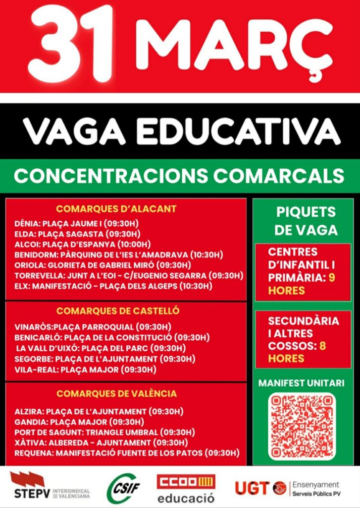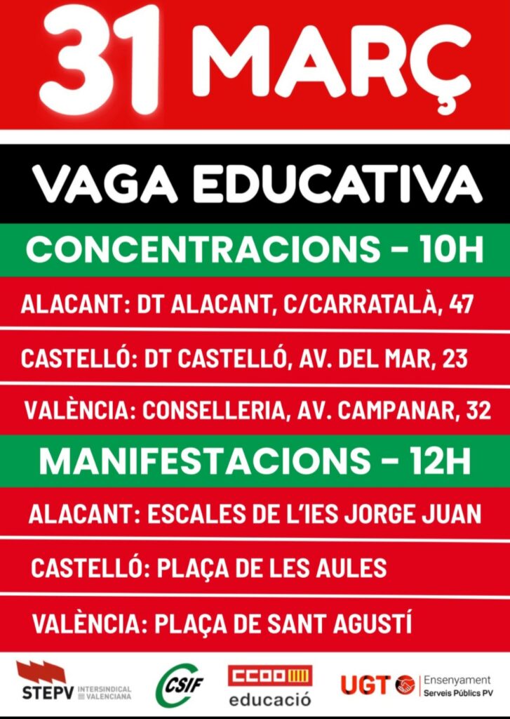 El manifest recull reivindicacions com la recuperació del poder adquisitiu, la reducció de ràtios, la recuperació del professorat retallat, la cobertura immediata de totes les places i substitucions, la millora de l’ensenyament en valencià, un pla d’infraestructures educatives i un millor reconeixement professional del personal d’Administració i Serveis i d’Atenció Educativa. Davant l’absència de propostes concretes per part de la Conselleria i els successius ajornaments, la jornada de vaga del 31 de març es planteja com una eina de pressió imprescindible per reclamar, amb una sola veu, una negociació efectiva ja.