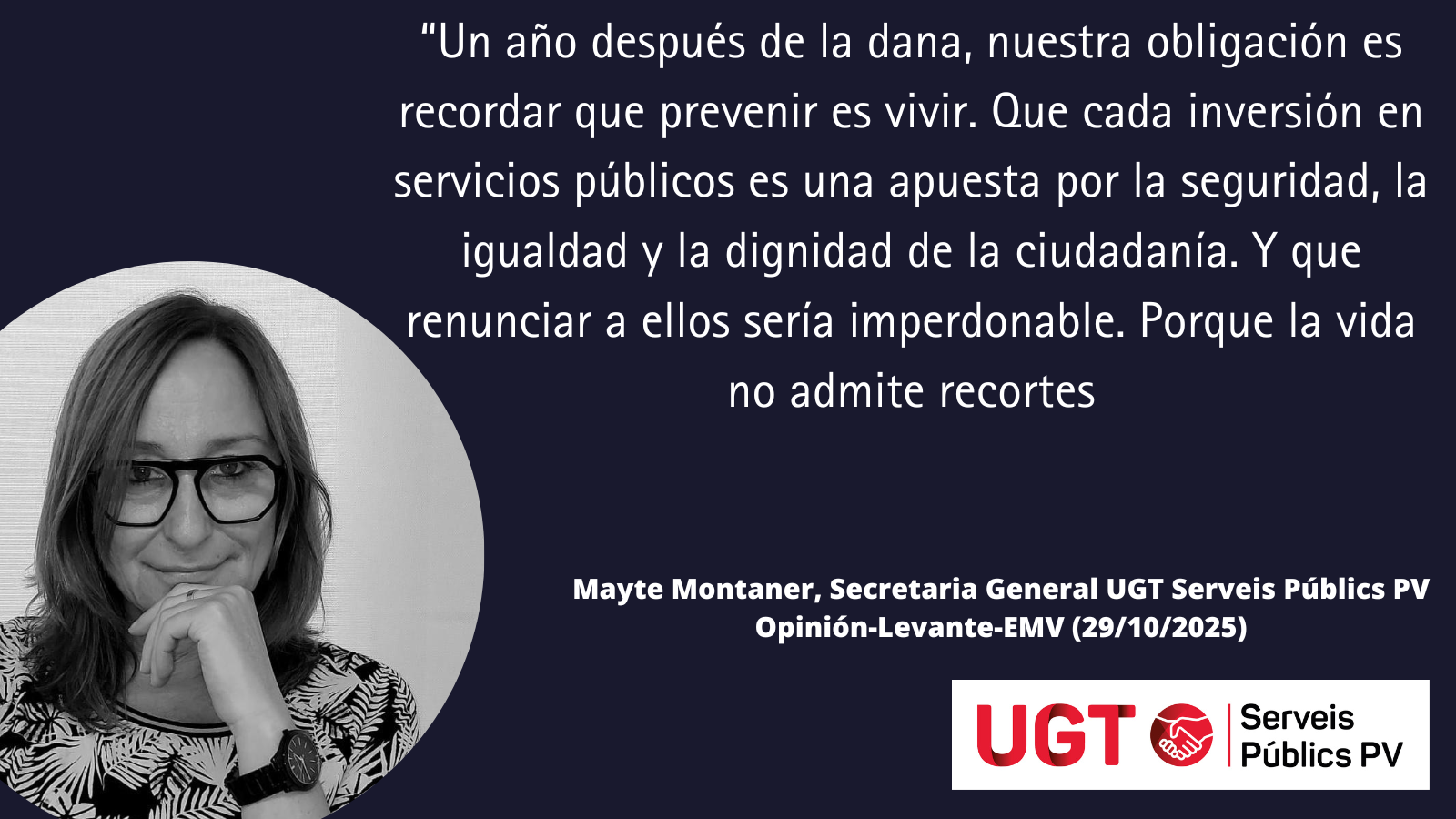 Compartimos el artículo de opinión publicado por la secretaria general de UGT Serveis Públics PV este martes en el diario Levante-EMV, con motivo del primer aniversario de la tragedia de la Dana