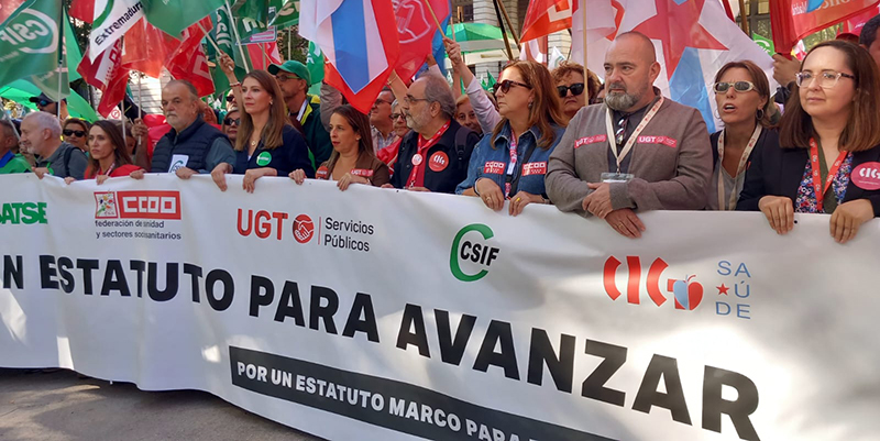 Convocadas por las organizaciones sindicales con representación en el Ámbito de Negociación (SATSE-FSES, FSS-CCOO, UGT, CSIF y CIG-Saúde) y procedentes de todas las autonomías, las trabajadoras y los trabajadores de las distintas categorías profesionales del Sistema Nacional de Salud (SNS) han portado pancartas y coreado lemas con el único objetivo de lograr un “Estatuto para avanzar” en sus derechos laborales.