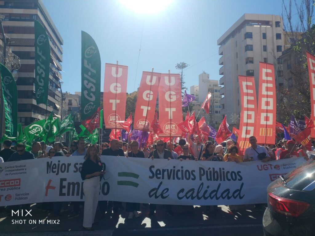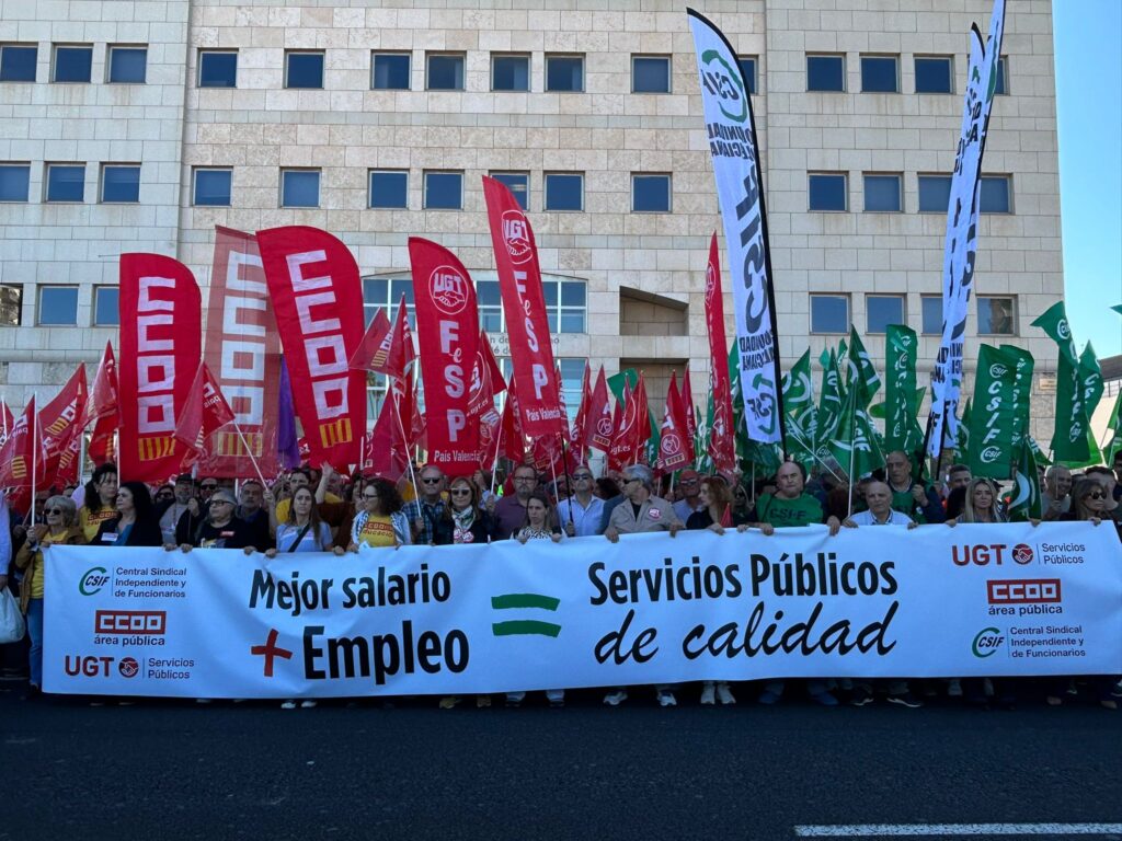 UGT Servicios Públicos, el Área Pública de CCOO y CSIF se han manifestado en la Comunitat Valenciana por unos servicios públicos de calidad, incrementos salariales, más ocupación pública y mejora de las condiciones laborales para cerca de 300.000 empleadas y empleados públicos valencianos. Gracias a la presión de las movilizaciones, el Gobierno ha convocado a los sindicatos para abrir la negocación.