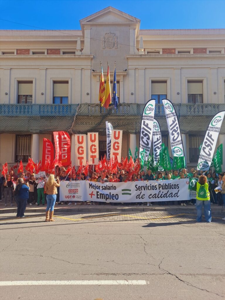 UGT Servicios Públicos, el Área Pública de CCOO y CSIF se han concentrado este jueves, 30 de octubre, ante el Ministerio de Función Pública y ante las delegaciones y subdelegaciones del Gobierno en toda España para exigir unos servicios públicos de calidad, incrementos salariales, más ocupación y mejora de las condiciones laborales para más de tres millones y medio de empleadas y empleados públicos. En particular, en la Comunitat Valenciana, las concentraciones han tenido lugar en las sedes de las subdelegaciones de Gobierno de Valencia, Castellón y Alicante. En el ámbito autonómico, las reivindicaciones laborales y salariales afecta a más de 300.000 empleados y empleadas públicos.