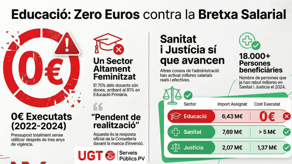 UGT Serveis Públics del País Valencià ha denunciat que la Conselleria d’Educació ha executat zero euros del programa contra la bretxa salarial malgrat ser un dels sectors més feminitzats. Amb motiu del dia europeu per la Igualtat Salarial que se celebra este diumenge, 22 de febrer, el sindicat critica que, mentres Sanitat, Justícia i altres sectors de la Generalitat, sí han vist millores retributives amb càrrec al programa contra la bretxa salarial del període 2022 i 2024, el professorat valencià seguix sense rebre ni un sol euro d’este fons. Segons dades oficials sobre la distribució dels fons 2022 2024, dotat amb 19,5 milions, Educació, no ha repartit els 2,14 milions d’euros que tenia assignats durant els tres anys consecutius. De fet, este departament reconeix que este repartiment està “pendent de realització”.