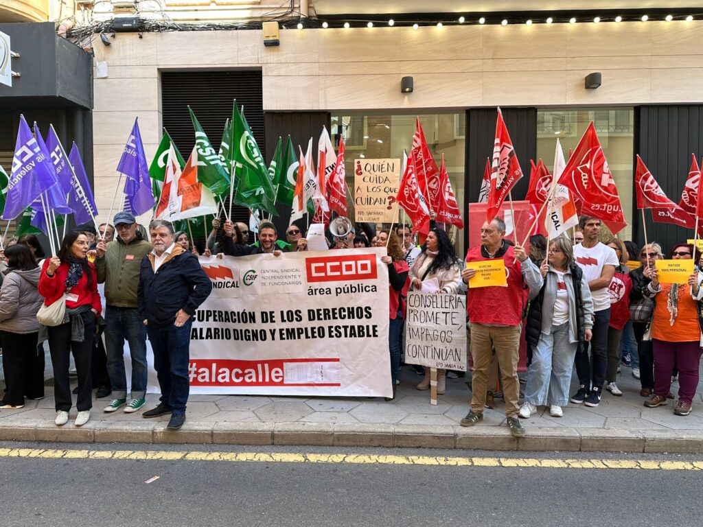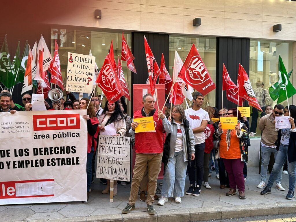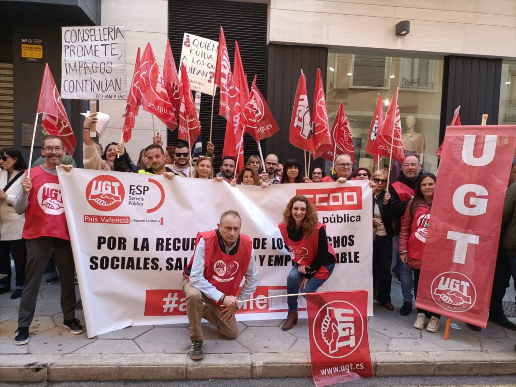 Trabajadoras y trabajadores de los centros de Servicios Sociales de la provincia de Alicante se han concentrado hoy de nuevo ante la sede de la Secretaría Territorial de Servicios Sociales para denunciar que la Conselleria sigue sin abonar la Festividad, Nocturnidad y Turnicidad (FNT), así como otros conceptos como carrera profesional y trienios ya reconocidos pero no pagados. Una protesta convocada por UGT Serveis Públics del País Valencià y por otros sindicatos. Cabe recordar que los sindicatos UGT Serveis Públics, CC OO, CSIF e Intersindical ya convocaron movilizaciones el paso mes de febrero para reclamar esta deuda, además de la pendiente a otro personal por las sustituciones realizadas y no pagadas.