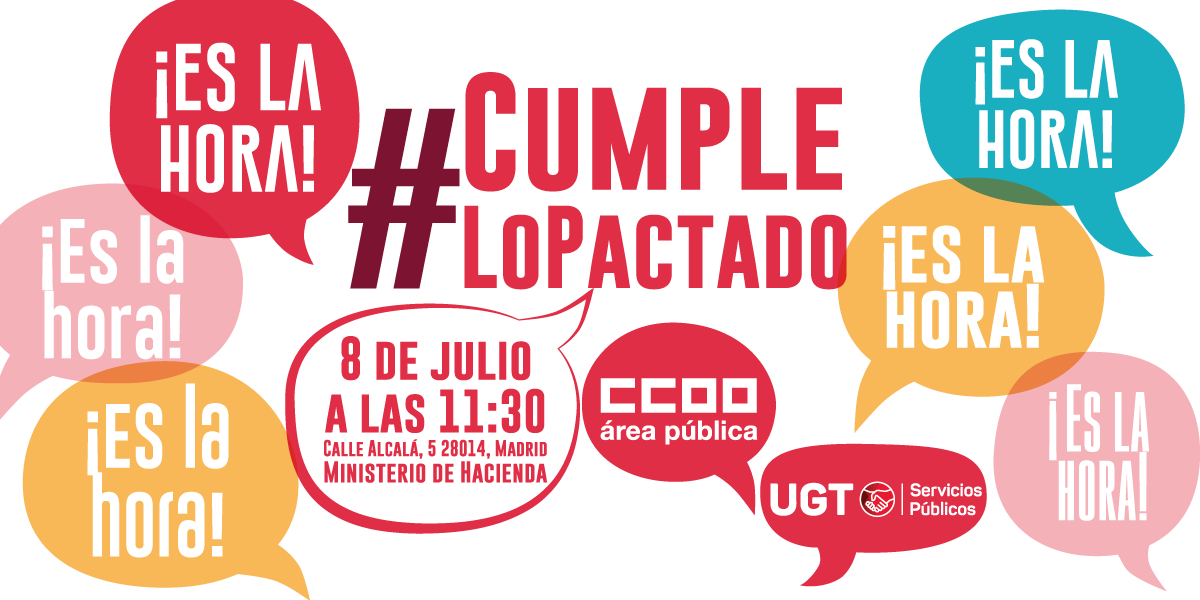 Por ello, el próximo martes 8 de julio, a las 11:30 horas, se llevará a cabo una concentración ante el Ministerio de Hacienda bajo el lema ‘Es la hora. #Cumple lo pactado’, una movilización para recordar a la Administración que las personas trabajadoras en el empleo público están aún a la espera de que se les dé una solución a la jubilación parcial para el personal laboral y la plena implantación para el personal funcionario y estatutario, que se aplique la jornada de 35 horas y la culminación de los procesos de estabilización que acabe con la lacra que supone la temporalidad en el sector público.